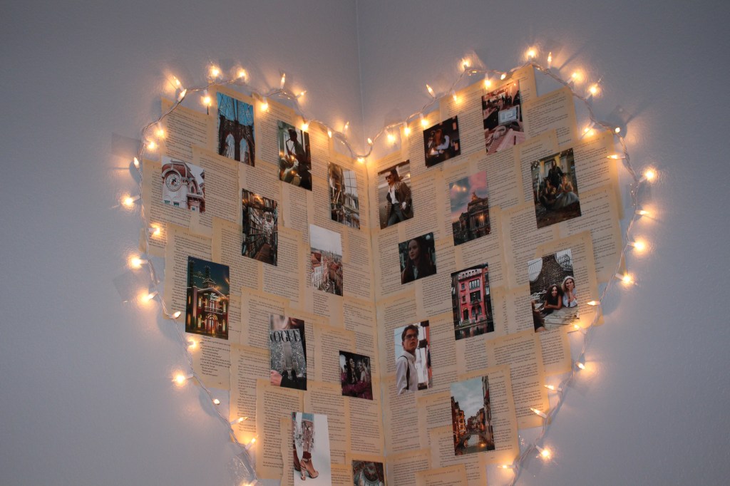 - Heart collage: Use patterned/colored paper or even an old paperback book you no longer need, layer the pages on the wall forming a heart shape, then collage your pictures on top. I put my collage in the corner, for a more interesting focal point.